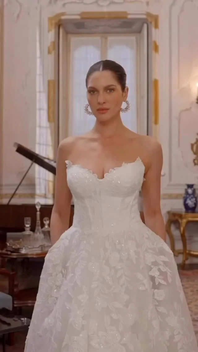 R3651 Petal is a floral lace sheath gown from Romance by Allure Bridals. She has a sweetheart neckline, sparkle tulle underlay and a beautiful, sheer floral train with buttons running the length of the bodice to the end of the train.